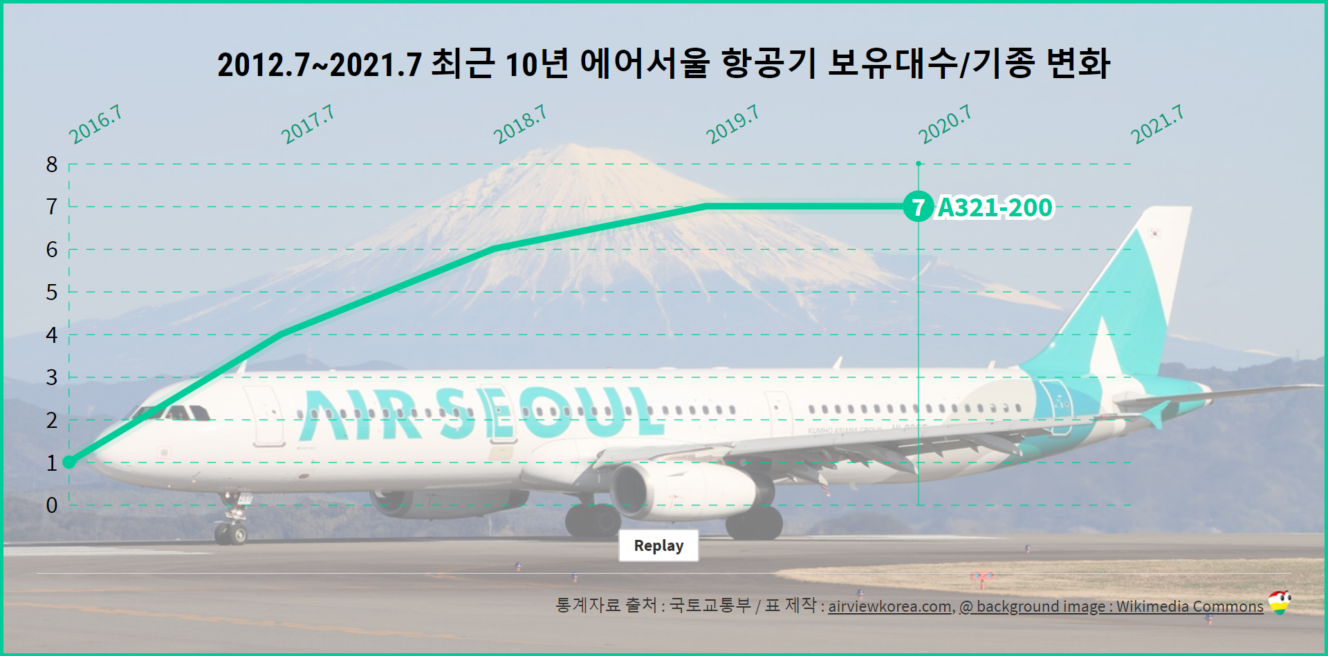 2021년 7월을 기준으로, 최근 5년간 에어서울의 비행기 보유기종, 보유대수 변화에 대해 알아보겠습니다.
