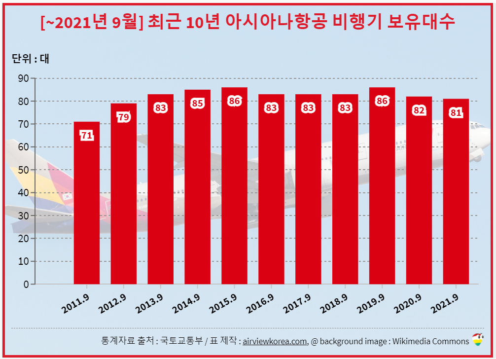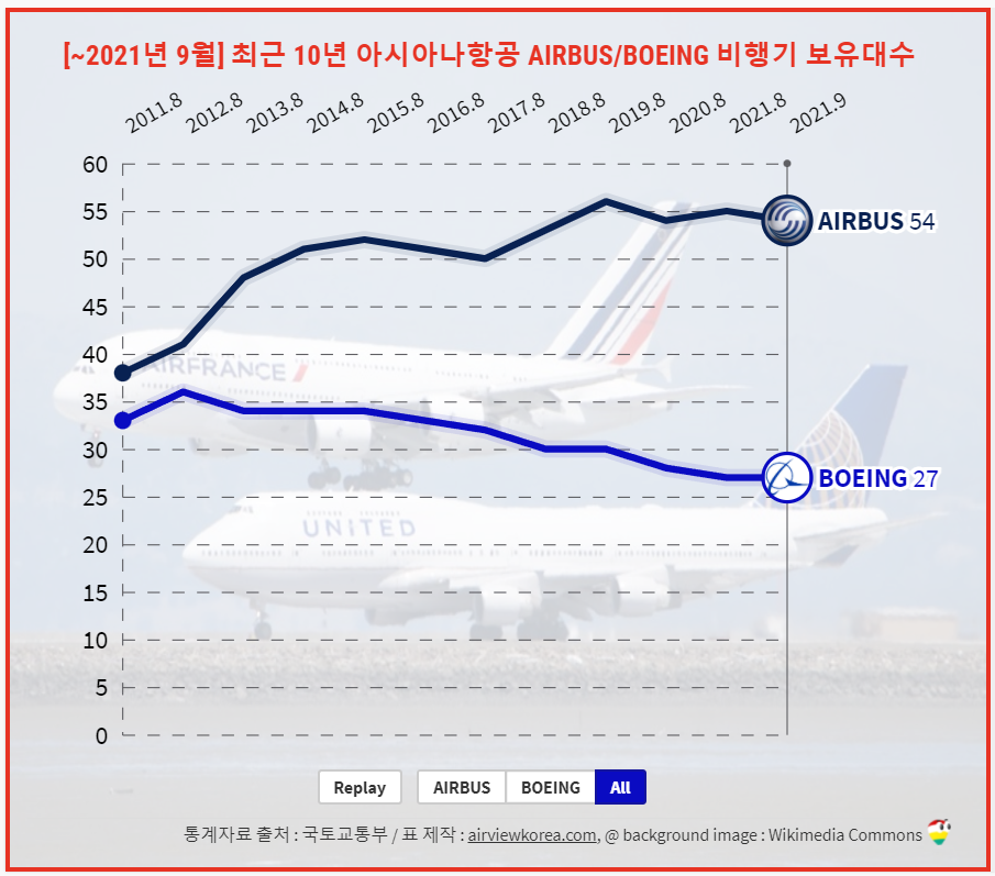 [~2021년 9월] 최근 10년 아시아나항공 비행기는 몇대일까? 보유대수/보유기종 변화 (BOEING[보잉] AIRBUS[에어버스] 항공기)