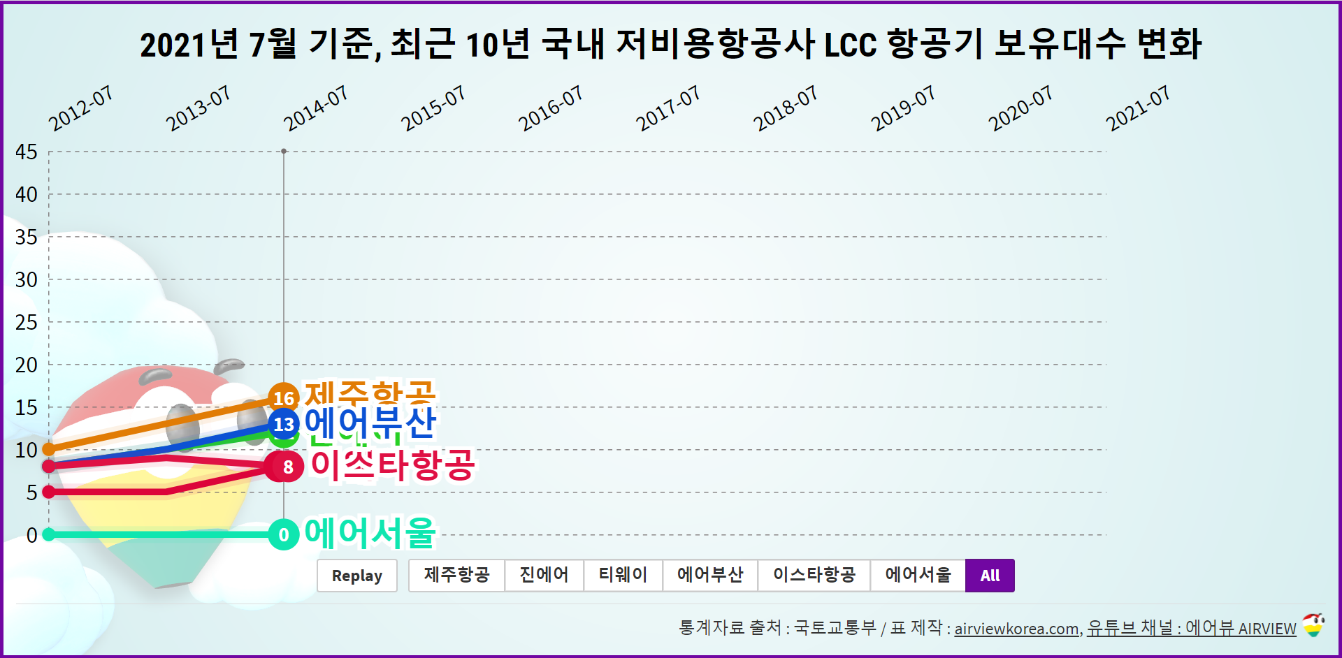 [2021년 7월 기준] 최근 10년 우리나라 저가항공사 LCC 비행기 보유대수 변화 현황