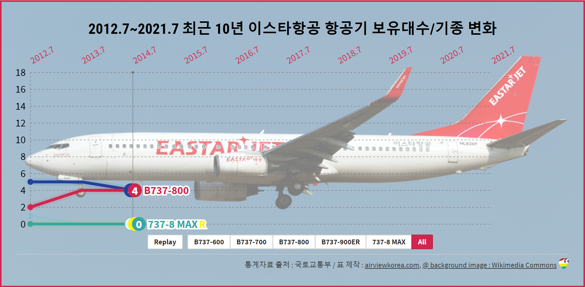 [2021년 7월 기준] 최근 10년 이스타항공 비행기 보유기종/보유대수 변화 (항공기 보잉 B737-800 / B737-8MAX)