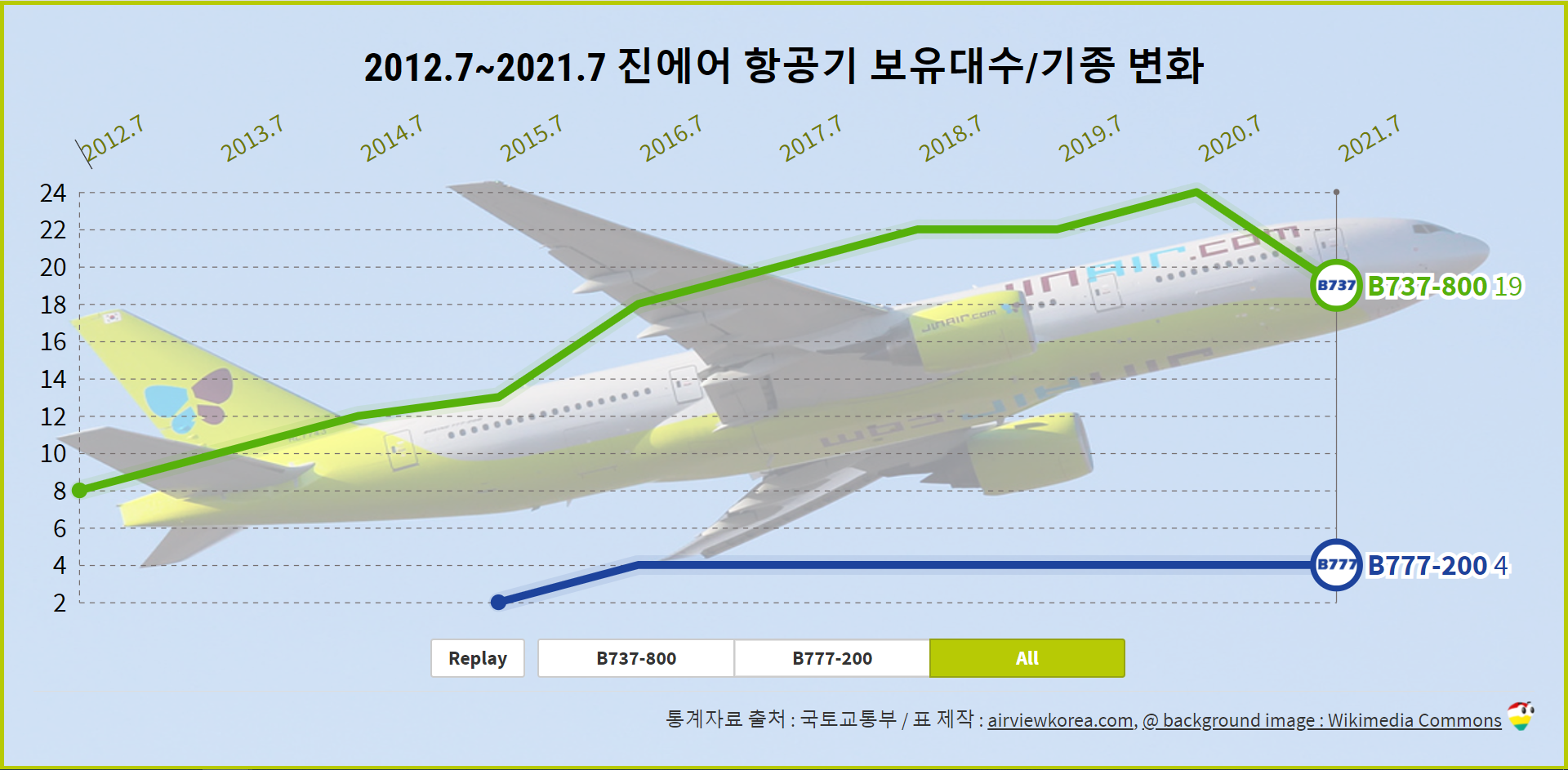[2021년 7월 기준] 최근 10년 진에어 비행기 보유기종/보유대수 변화 (항공기 보잉 B737-800 / B777-200)