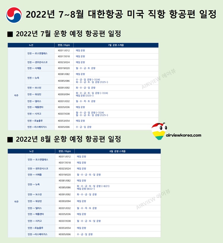 2022년 7월~8월 대한항공 미국 노선 운항 일정