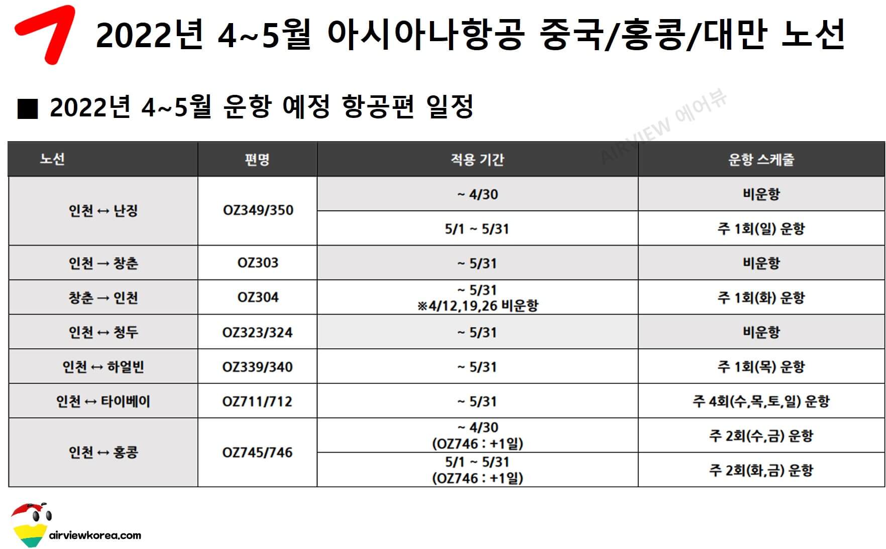 2022년 4~5월 아시아나항공, 중국/홍콩/대만 노선 운항 스케쥴