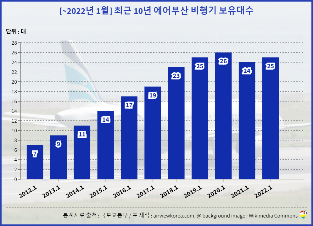 에어부산은 작년 1월에 비해 1대를 도입하여, 2022년 1월 기준 25대를 보유하고 있습니다.