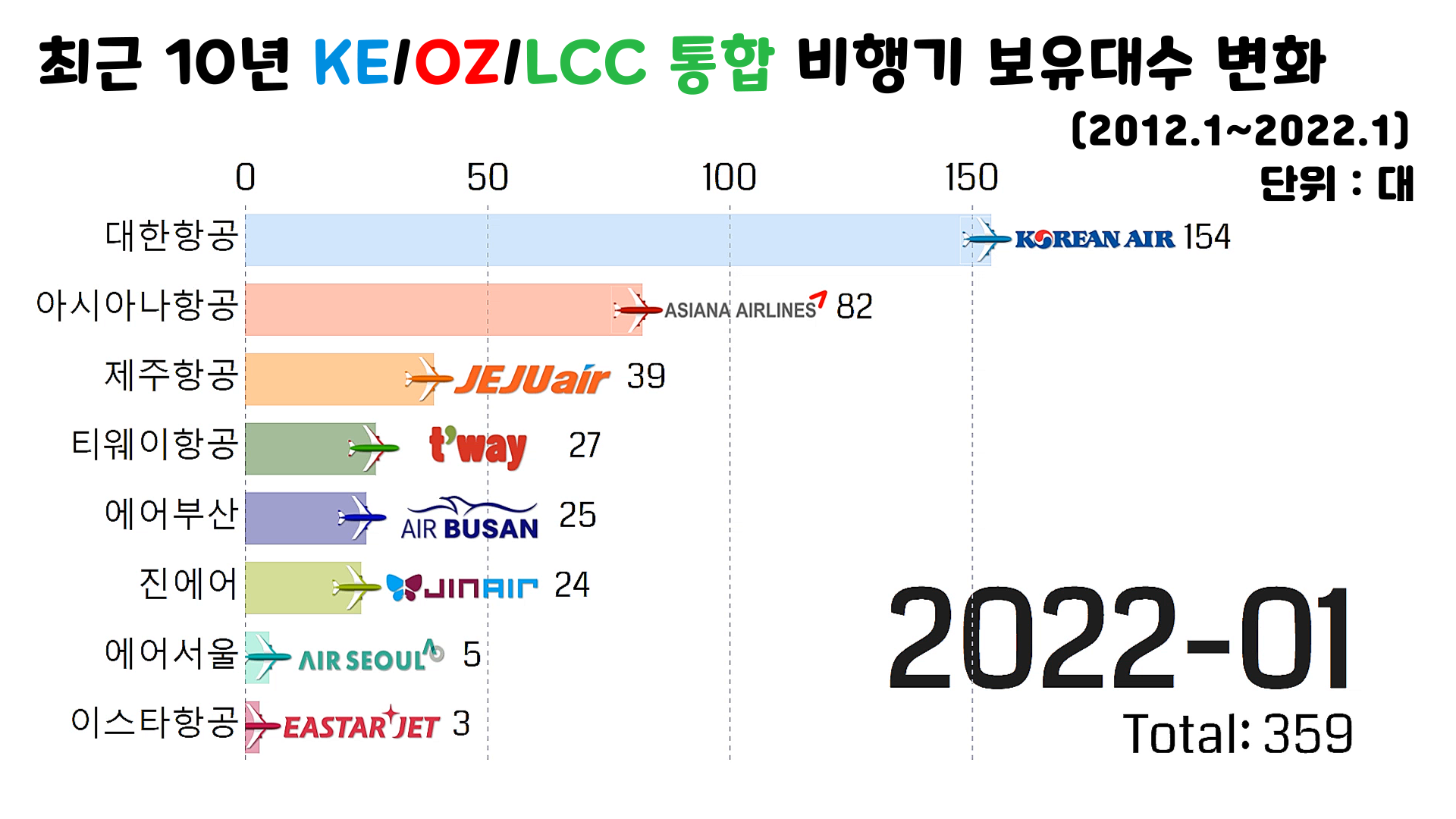 [2022년 1월] 지난달 대비 우리나라 항공사들 비행기 보유대수 변동량