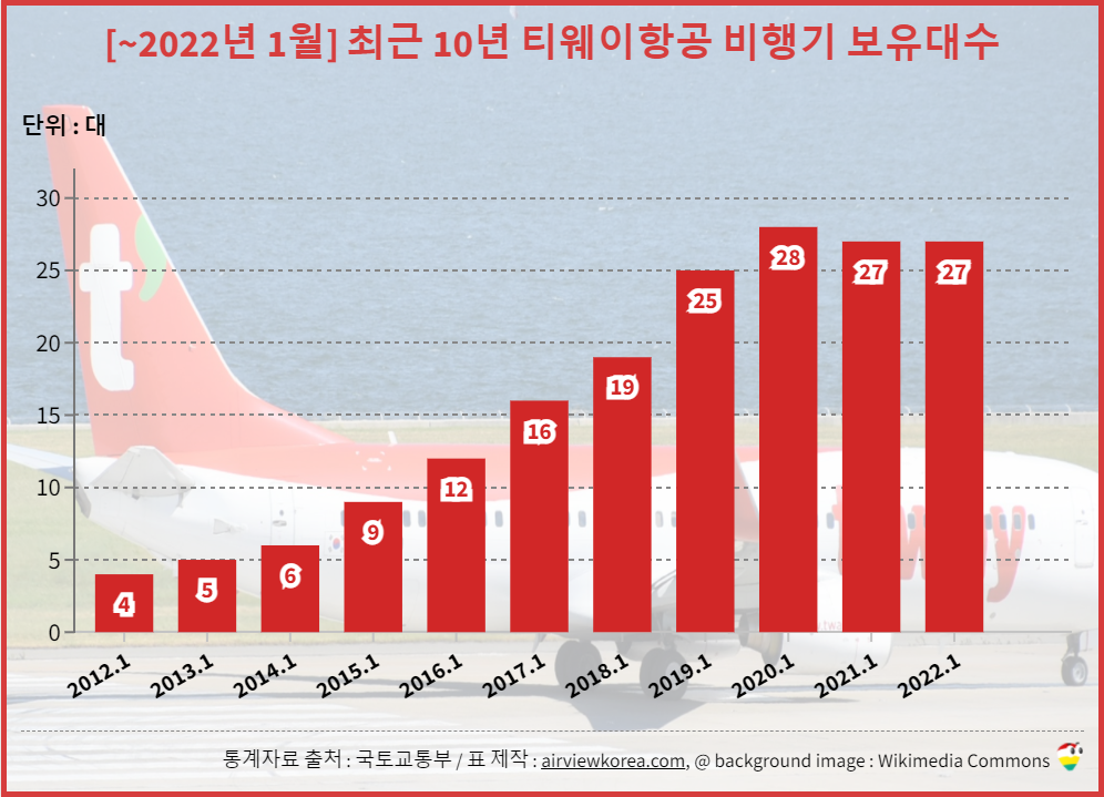 [~2022년 1월] 최근 10년 티웨이항공 비행기 보유대수