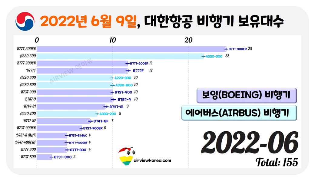 2022년 6월 9일, 대한항공 비행기 보유대수와 기종