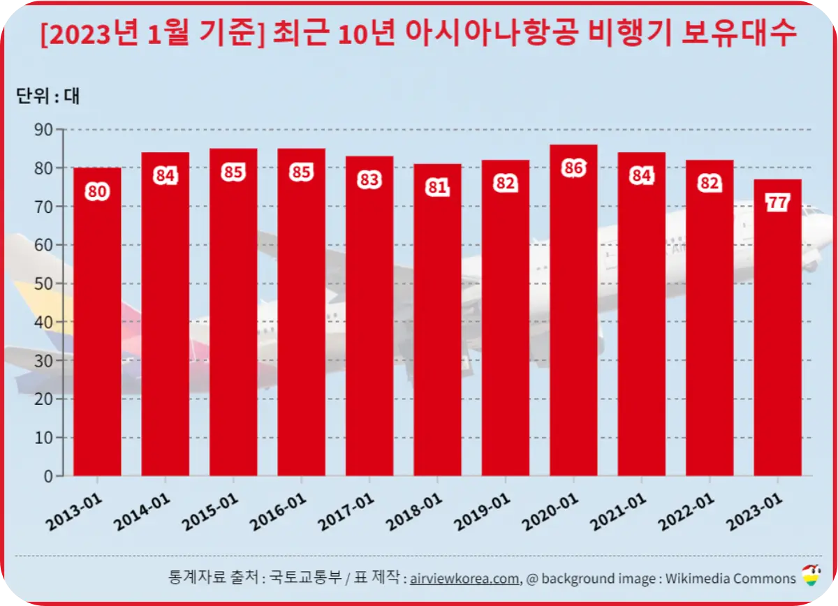 아시아나항공 비행기 보유대수와 최근 10년 경향