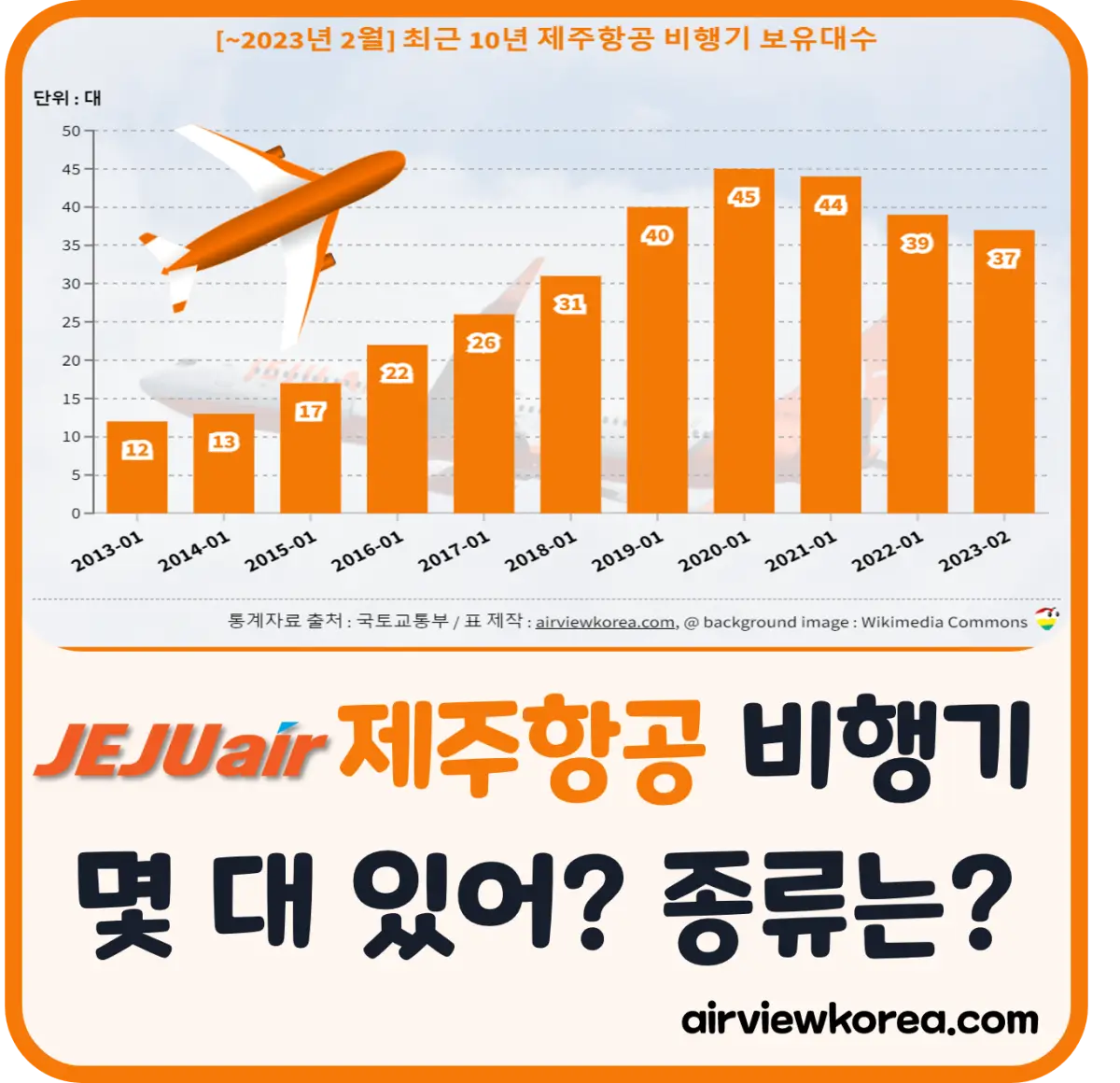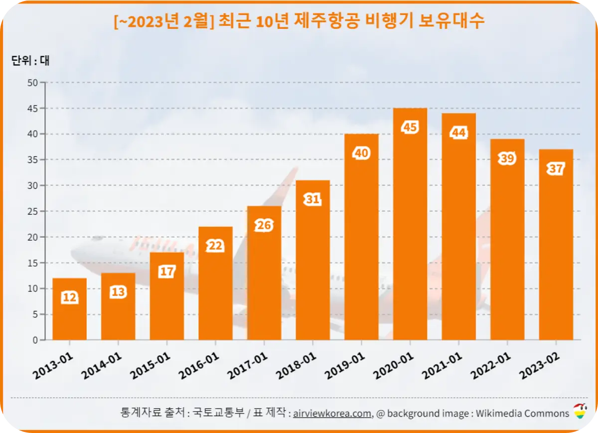 제주항공은 우리나라 전체 항공사 중 3등, 저가항공사 중에서는 1등으로 37대를 보유하고 있습니다.