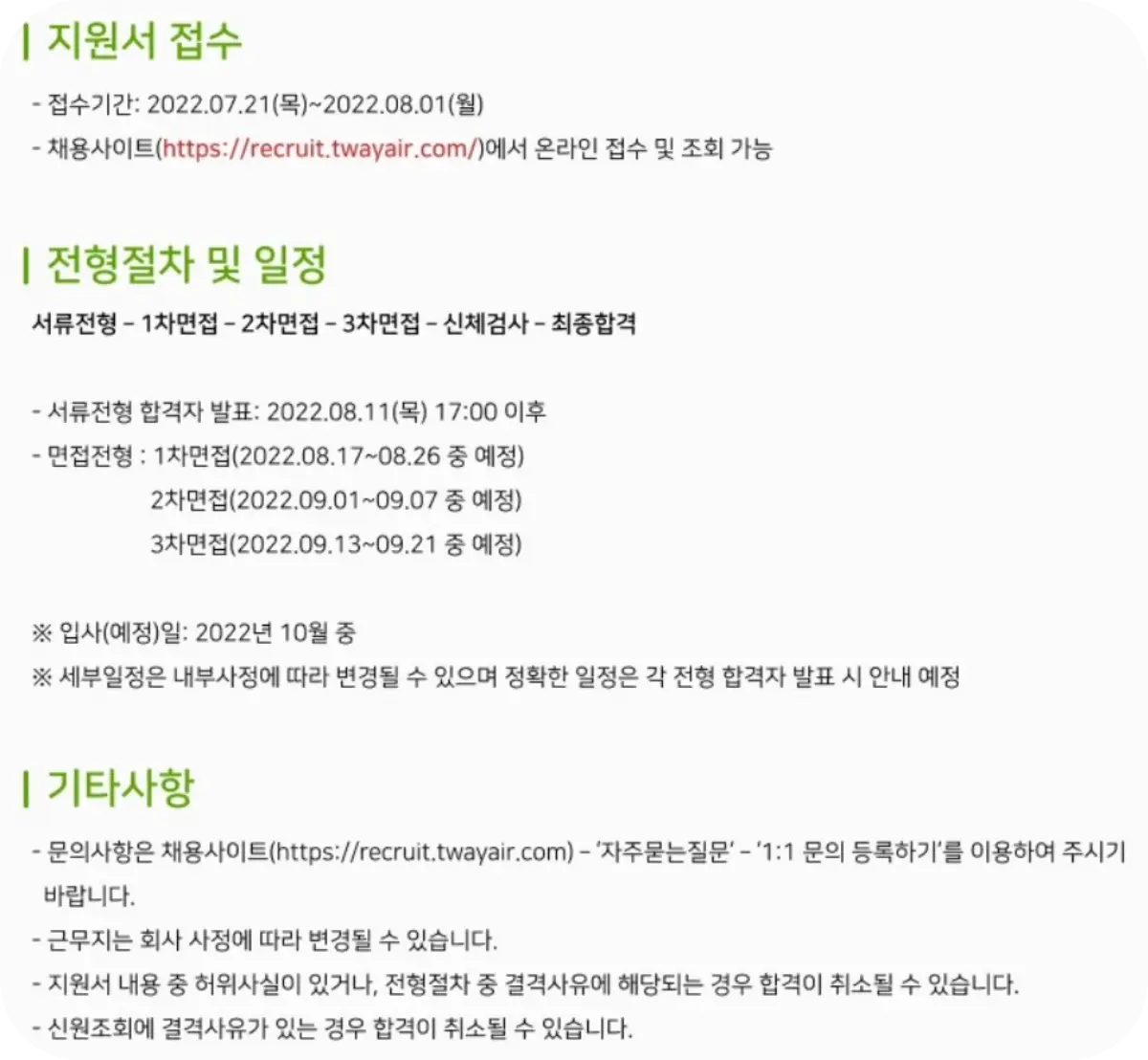 2022년 7월, 티웨이항공 객실승무원(인턴) 채용 일정