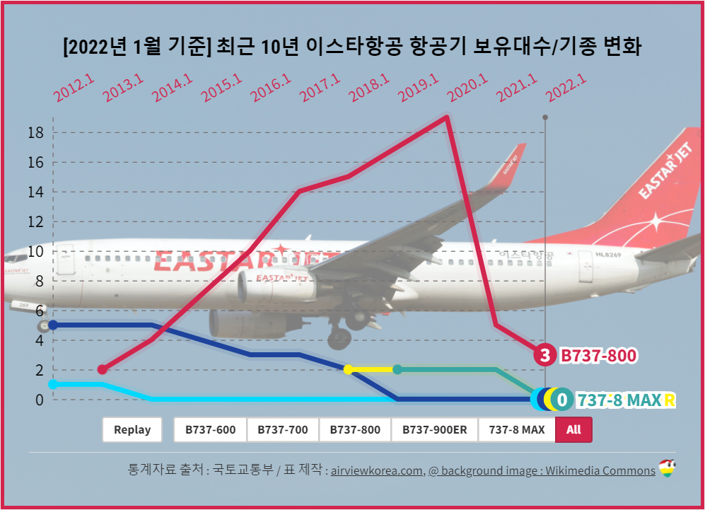 [2022년 1월 기준] 최근 10년 이스타항공 보유 항공기종/보유수량 변화 (BOEING B737-600/-700/-800/-900ER/MAX)