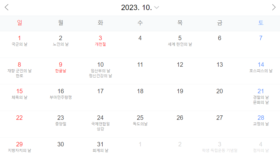아쉽게도 2023년에는 4일 연휴는 설날과 추석 두번입니다.