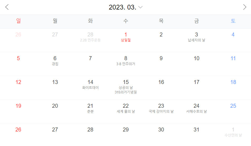 3월의 휴일은 수요일로, 첫째주는 앞, 뒤로 휴가를 붙여 쓰시는 분들이 많을 것으로 예상됩니다.