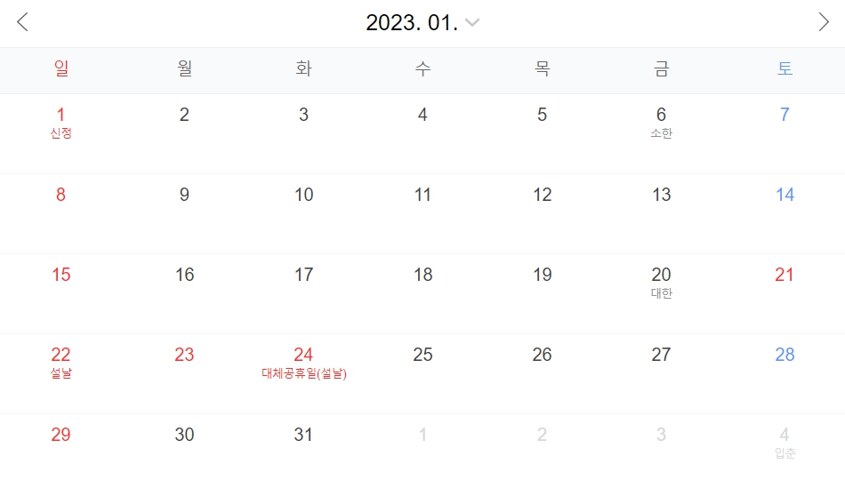 2023년 설은 1월 중순에 있으며 4일 연휴로 긴 편입니다