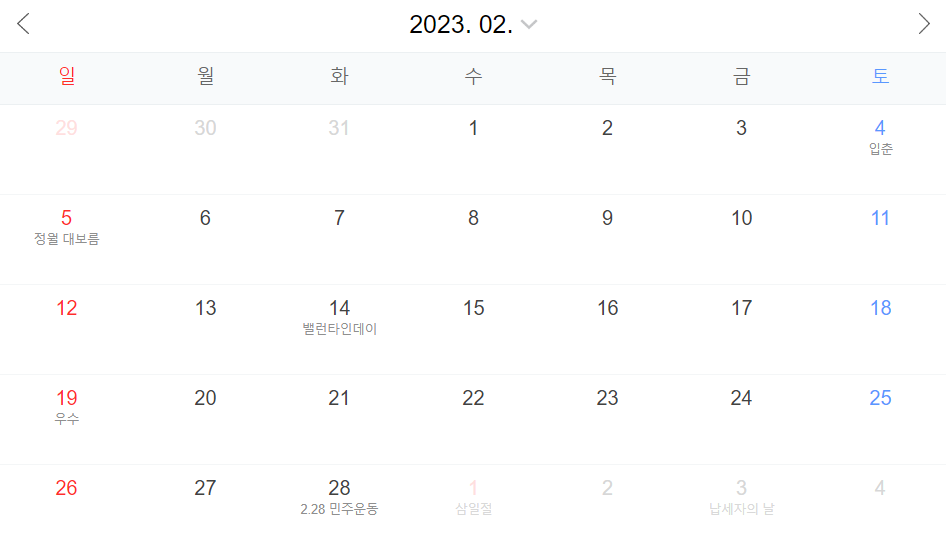 2023년 2월은 아쉽게도 휴일이 없으며, 29일도 없는 해입니다.