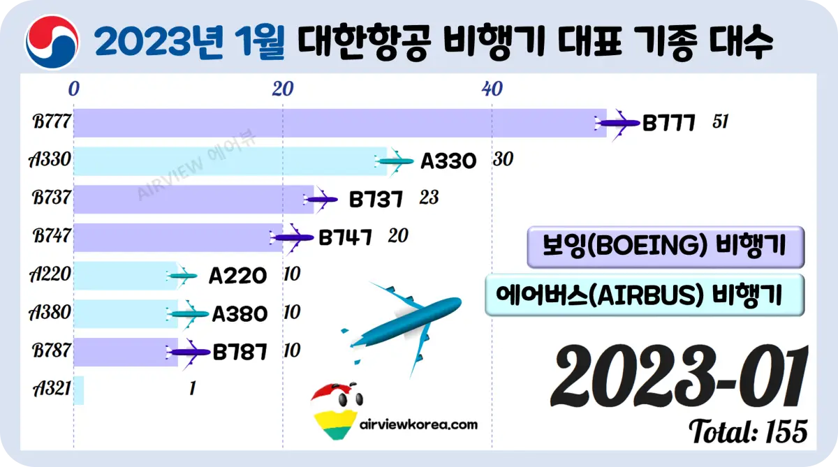 2023년 1월 기준, 대한항공 AIRBUS/BOEING 대표 기종별 보유대수