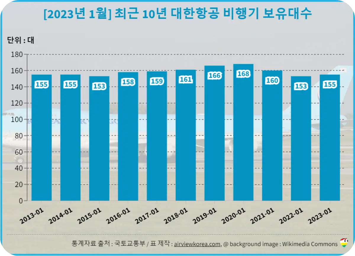 2023년 1월 기준, 최근 10년 대한항공 비행기 보유대수