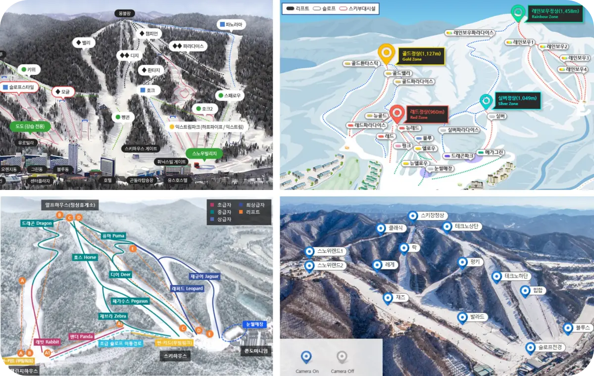 스키장마다 슬로프 구성의 차이가 크며, 각 스키장의 코스 정보는 아래 공식 홈페이지 링크에서 자세히 볼 수 있습니다.