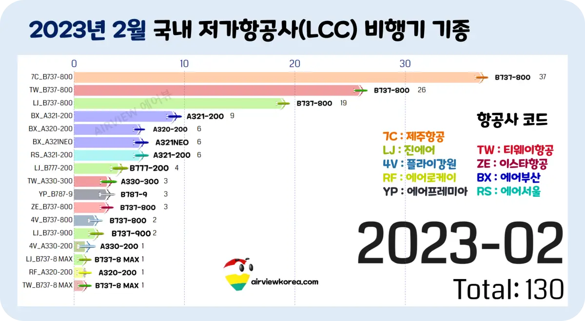 2023년 2월 한국 저비용 항공사 비행기 보유 기종별 대수