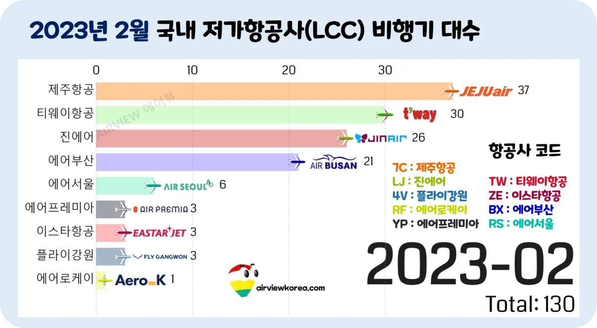 2023년 2월 한국 저비용 항공사(LCC) 비행기 보유 대수