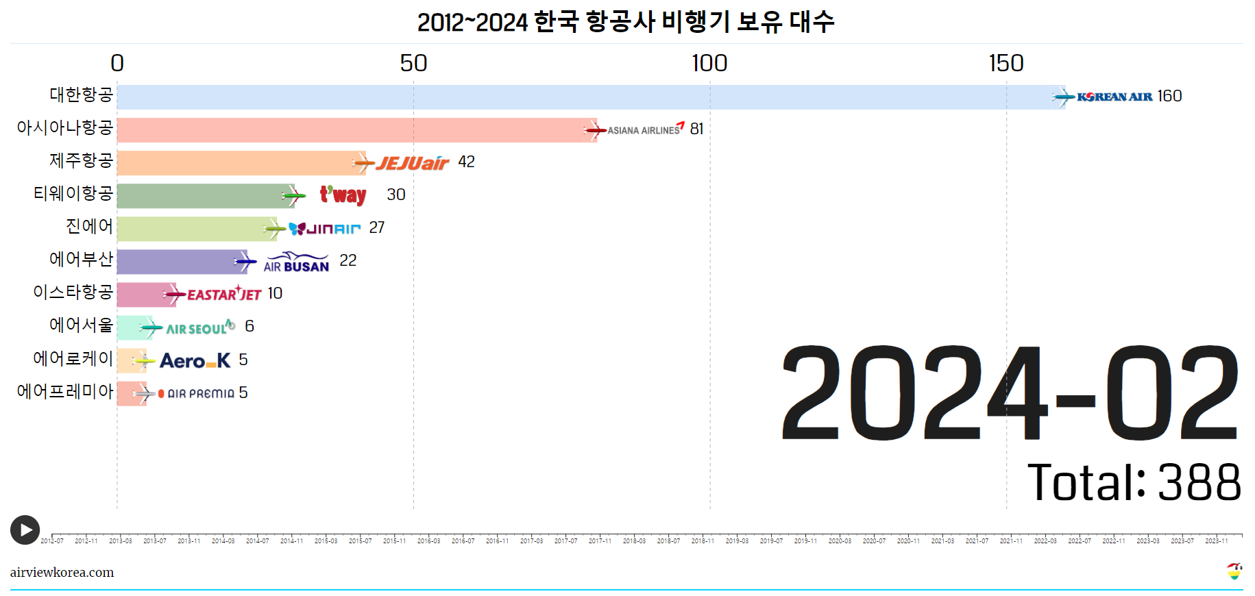총 10개의 국적 항공사가 현재 운영 중인 항공기 대수는 380대가 넘는다