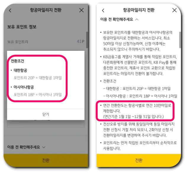 8. 대한항공 마일리지 전환 비율 및 한도 확인